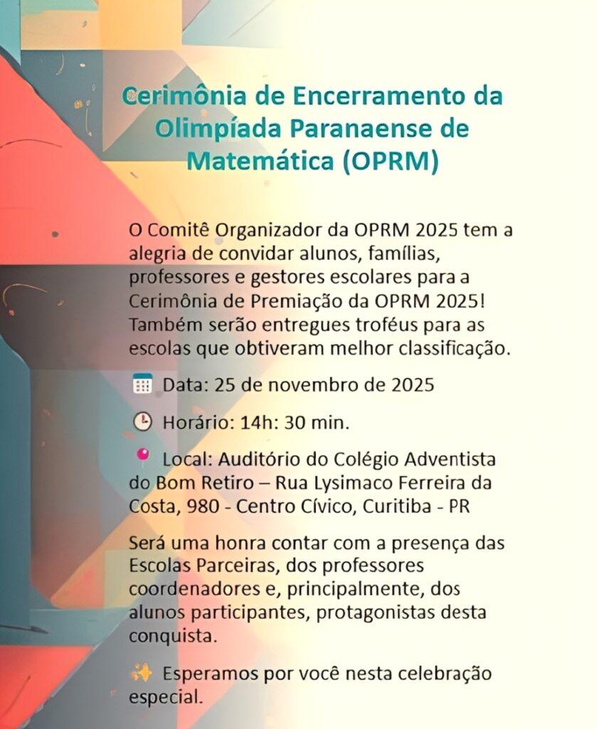 O convite está feito: Venha prestigiar os talentos da Olimpíada Paranaense de Matemática (OPRM 2025) na grande Cerimônia de Encerramento e Premiação!